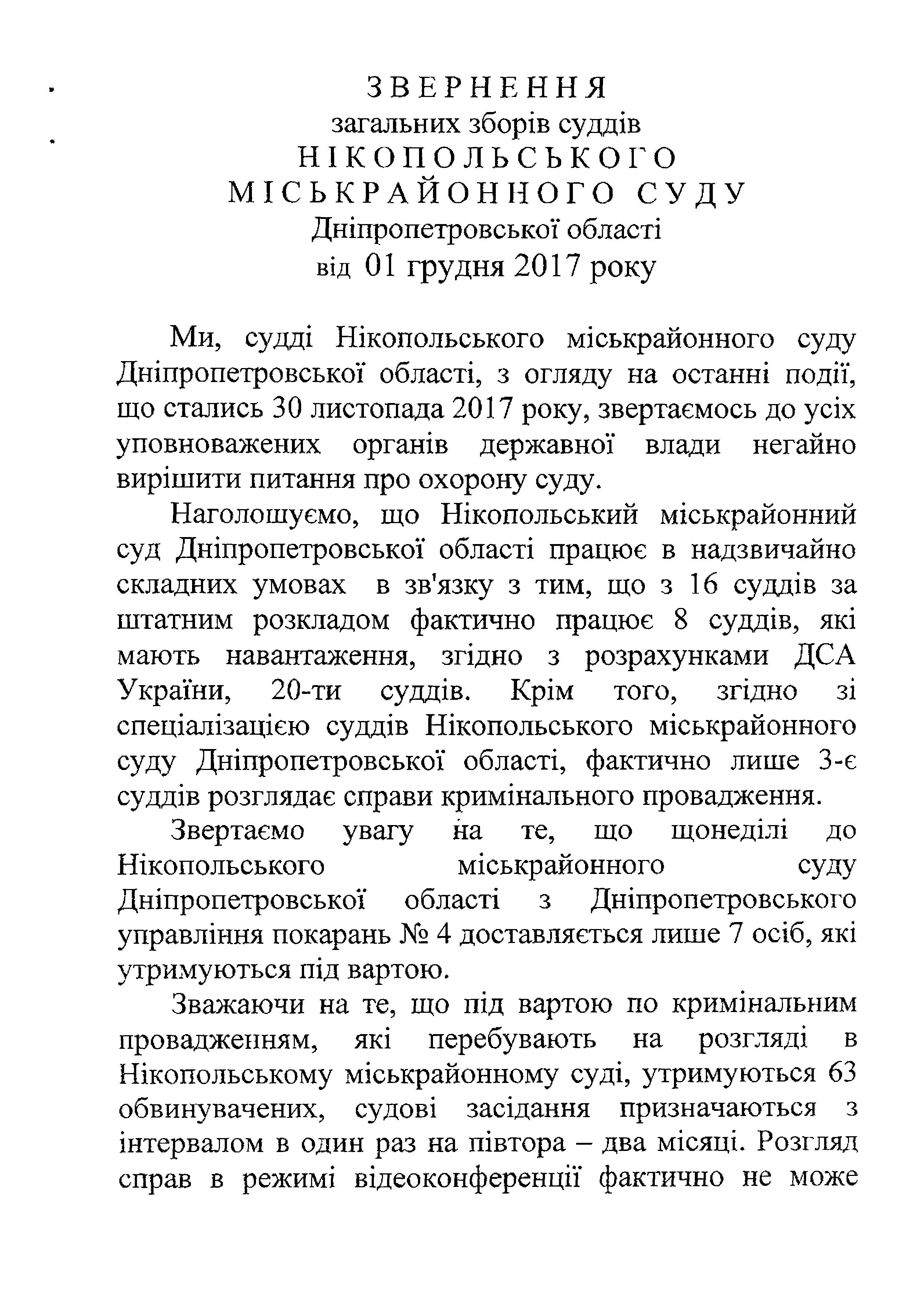 Звернення загальних зборів суддів Нікопольського міськрайонного суду Дніпропетровської області