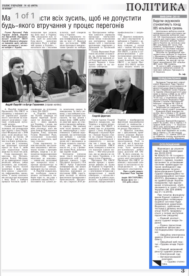 Сьогодні, 1 березня 2019 року, в газеті "Голос України" (№ 42 (7048)від 01.03.2019) опубліковано повідомлення про відкликання ДСА України оголошення, опублікованого в газеті "Голос України" (№ 229 (6984) від 01.12.2018) щодо створення та забезпечення функціонування Єдиної судової інформаційно-телекомунікаційної системи.